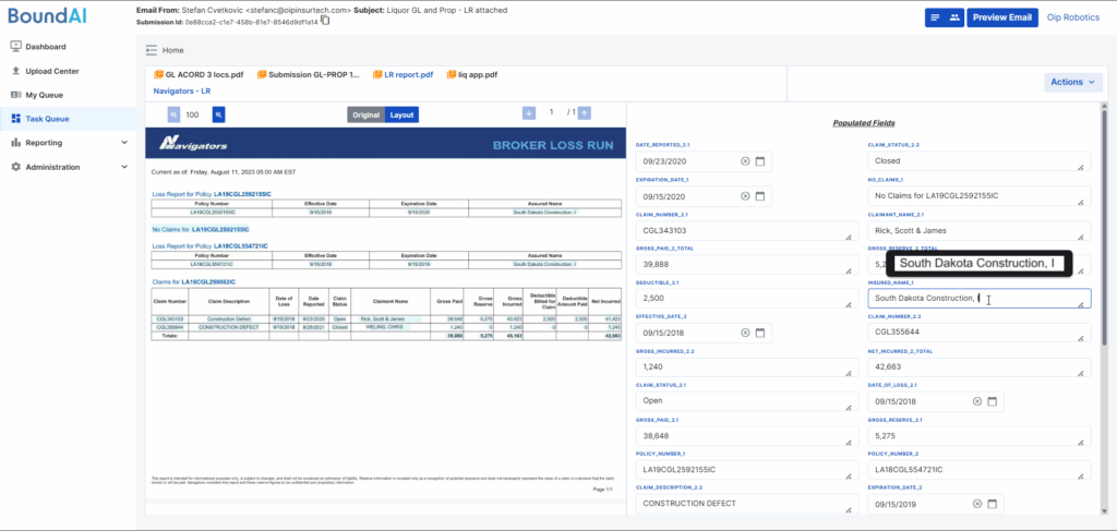 Bound AI reads claims files, FNOLs, submissions, SOVs, acords, endorsements, invoices, and broker emails with insurance-specific intelligence, and instantly extracts the details your teams need.