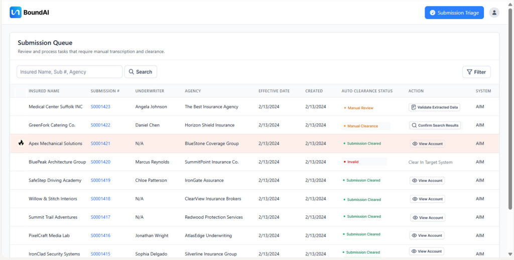 The safest automation opportunities are the ones that remove friction without touching decisions. Submission intake is the clearest example. Underwriters still spend hours downloading PDFs, renaming files, rekeying SOVs, and validating loss runs. AI solves this immediately. Tools like Bound AI can extract values from documents with high accuracy, standardize formats, validate totals, and deliver clean data into the workflow within minutes.
